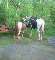 Monica och jag har varit med hästarna i Bunkertorp. Vi red med hästarna till August Werner och sedan över till Lindomes golfbana som ligger vid Bunkertorp. Det är väldigt fina ridvägar där om än lite branta. När vi hade ridit runt en stund så tyckte vi det var dags för fika och vilo stund för hästarna. Fika det var uppenbarligen hästarna också sugna på ( i alla fall på ost mackor) Beta gräs när det finns mackor och saft.