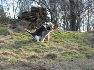 Tisdagstema: Styrka Detta är en gammal bild men våran katt Fimpen tar fortfarande ett grabbatag på Shakira och försöker vrida runt henne på rygg. Även om han inte lyckas så bra nu så har han en inre styrka, för han ger aldrig upp.
