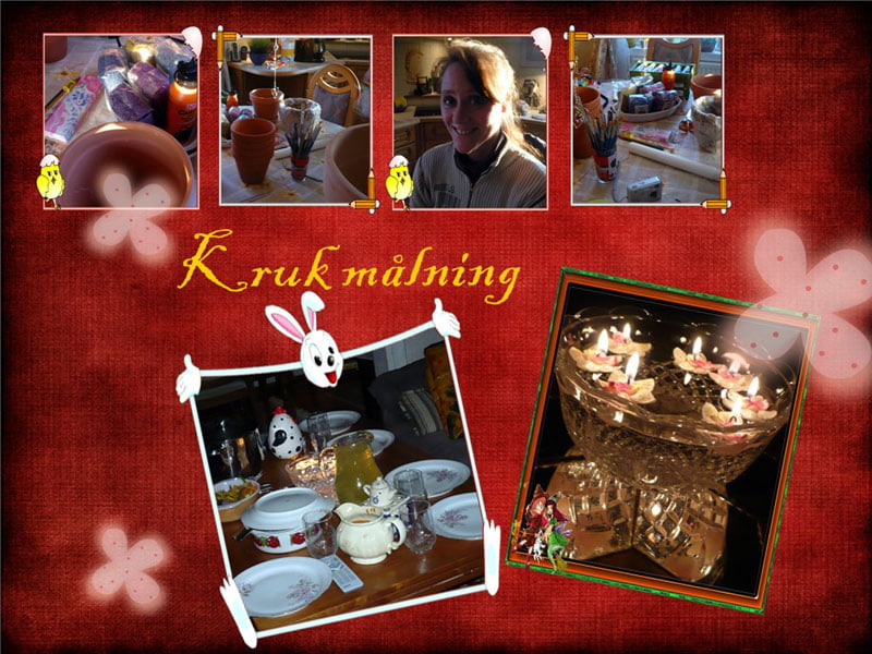 När Elvy hade kämpat en bit men sin mall så frågade hon var jag hade gjort av min pappas egenbyggda ljus låda var. Jag brukade använda den flitigt när jag gjorde målningar på barnens kläder när de var små. Det var så typiskt att jag gått upp till loftet med lådan, det blev till att springa och hämta. Elvy skulle ju rita mängder av fiskar och koraller så ljus lådan var nästan ett måste. Hon han heller inte färdigt utan tog med sig färgad sand och får fortsätta hemma. Nu skall jag sätta mig och måla vidare på min kruka, den lär nog ta ett tag innan jag blir klar. Rosa har en bild på de 3 kärringarna jag skall måla, glömde ta kort på bilden.