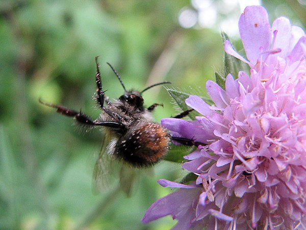 Dagens bild är på en vimsig humla. När vi grejade i hagen såg jag den här humlan och den var ju så slö och konstig. När jag körde fram linsen så försökte den klättra över på linsen som om det var världens vackraste blomma den såg. Hm det kanske var jag som var för närgången och putte av den från blomman. Hur som helst så ser det ut som den har fått på tok för mycket pollen i sig.