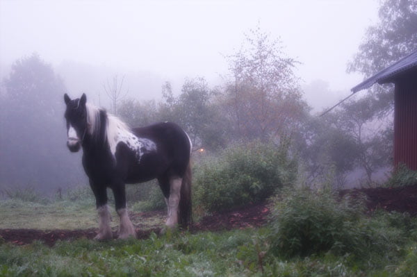 Dagens bild är på Bellman. Jag har så ruskigt svårt att gå upp på morgonen när det är mörkt ute, och Micael är lika morgon trött han, så det blir ett evinnerligt tjat innan han går iväg till sin praktikplats. Det är väldigt dimmigt nu på morgonen och ser lite småmysigt ut, men det känns lite stressande att det kommer vara svart, när man går till jobbet och svart när man kommer hem. Den perioden är den jobbigaste tiden på året. Det var bara Bellman som stod utanför stallet i morse, (matvraket) Beethoven stod längst ner i hagen, så jag fick gå ner en bit för att han skulle höra när jag ropade. Det var så gott väder i går kväll att jag inte ville ta in dem, annars har det funkat kanon bra att ha dem inne på nätterna så hovarna får torka upp.