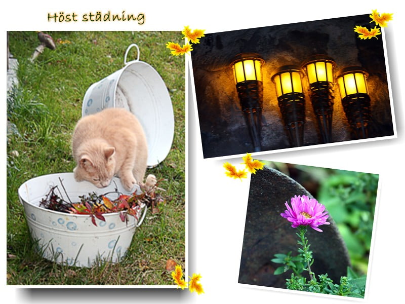 Jag fick klippt gräset en sista gång och hittade Shakiras bollar och leksakskorvar, som jag letat efter en längre tid. Jag har just nu en riktigt lycklig hund med massa leksaker vid sin bädd. Med andra ord en riktigt nyttig onsdag idag. Vi ställde in allt i rotkällaren, men lamporna började lysa på direkten när de kom in i mörkret så de satt vi ut igen. De klarar sig nog ute ett tag till. Skall ta och olja in dem så inte bambun möglar. Vi avslutade kvällen med god mat och idol tittande. Tusen Tack för hjälpen.