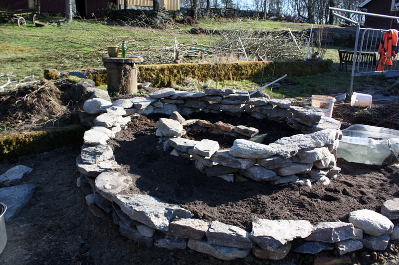 Usch jag har hållit på med kryddspiralen, trodde aldrig att den skulle vara så jobbig att göra. Tobias hjälpte till med att hämta stenar och när han frågade om vi kunde göra en sådan i hans trädgård kände jag bara ( Inte en chans ) fy tusan vilken urusel idé. Får hoppas jag känner mig mer positiv inställd när kryddorna kommer på plats. Visserligen börjar det ta form på plätten och jag kommer på mer grejer man kan göra, men åkgräsklipparen behöver nytt batteri så den la av innan jag hunnit köra färdigt jorden och skottkärran är det punka på.