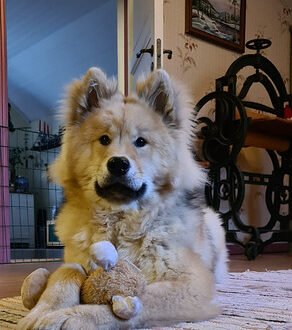 Det började redan mörkna och Shakira smälte in bra i de olika nyanserna av vitt och brunt. Det var bara när hon dundrade förbi som man märkte att hon var med. Rådjuren sprang åt alla håll och kanter när vi kom, men Shakira var bara för lycklig för att rusa efter. Det gällde ju att sniffa in vad som hänt under dagen och vilka vovvar som gått var. Helt otroligt att hon nu ligger och lugnt och myser, när hon alldeles nyss har farit fram som en torpet. Hon var så full av energi att hon busade runt medan jag fodrade. Hon bara ÄLSKAR snö!