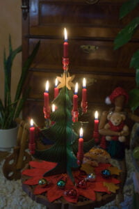 – Men herregud! Tur jag kom tillbaka, hon kan ju inte dekorera! Granen skall tändas, bullarna skall ätas upp – oj vilken jätte påse bäst att börja med de…. mmm mums…, nallarna skall sitta här….