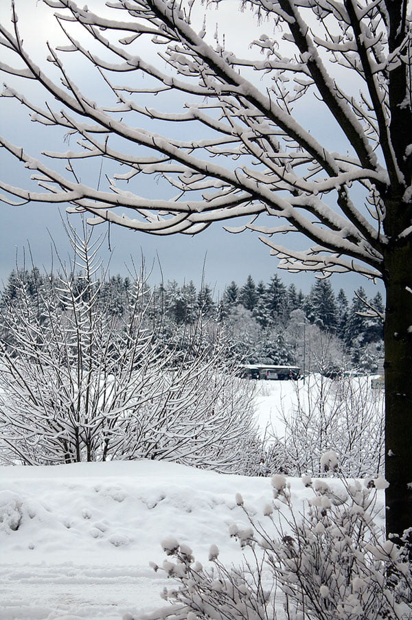 Det var så mysig blågrå färg när jag tittade ut genom fönstret och jag fotograferade trädet som var fullt av domherrar för två år sedan. Förr såg jag domherrar titt som tätt men nu går det år emellan. Spanar ut på träden varje dag i fall de dyker upp men än så länge är det bara blåmesar och skator som håller sig framme. Ja, en och annan älg och rådjur har traskat förbi fönstret men det är ganska sällsynt det med.