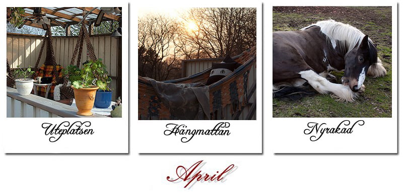 April – Hittar massa konstiga ägg i dammen och trädgården fullständigt exploderar av liv 🙂 Fixar till uteplatsen så att jag kan vara ute mesta möjliga och favoriten ( Min hängmatta ) kom på plats. Rakar mina pälsbollat till hästar och kunde raka ansiktena för första gången.