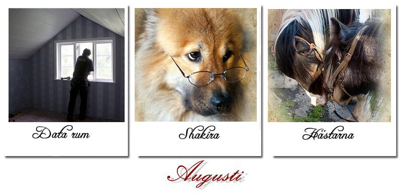 Augusti – Det börjar redan bli kallt på morgonen. Jag får börja använda glasögon och Shakira testar om de är något att ha 🙂 Fönsterna är utbytta hos Micael och övervåningens 2 rum tapetserade. Monica börjar få kanon kläm på Bellman och vi byter ut hästarnas mat. Får en god skörd på örterna och vill öka ut till nästa år.