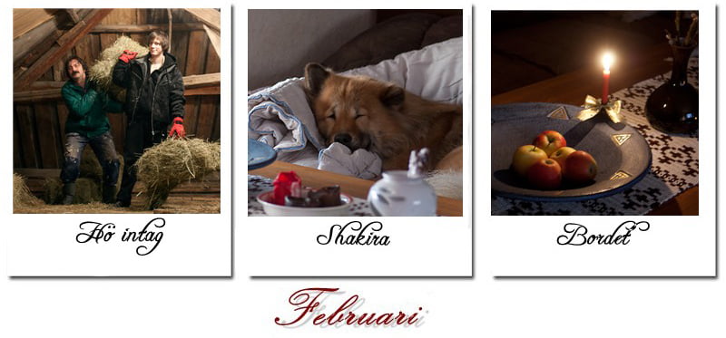 Februari – Kallt och blåsigt, vi laddar upp med hö. Jag får syn på en liten ilsken ekorre som förhoppningsvis kommer att efterträda den som drunknade i badkaret. Grannarna nere i hagen bygger som tokar på huset och jag tränar Shakira med hästarna.
