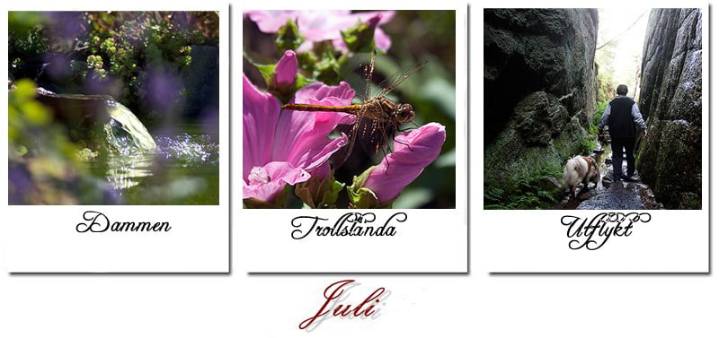 Juli – Kanon väder och jag älskar att vara runt dammen. I år har vi haft mängder av trollsländor i alla möjliga färger. Vi börjar så smått göra i ordning Micaels gamla rum till hobby rum. Tar en kanon utflykt till Sundsby Säteri och klättrar bland grottor. Semestern hägrar.
