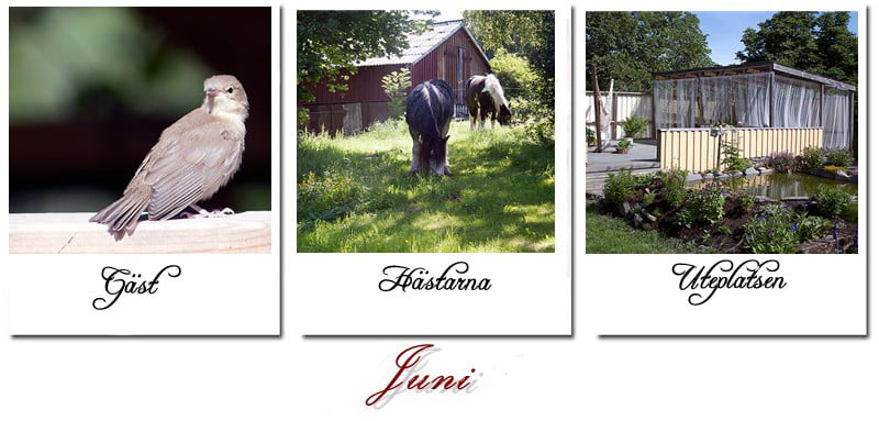 Juni – Trädgården frodas och jag sitter ofta i mitt plantering skydd och ser på djuren som kommer. Tar ner hästarna ända vid dammen så att de kan beta. Får se mängder av knepiga insekter och skaffar ett tele zoom. Släkten kommer på besök och firar Micael.