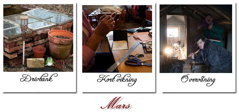 Mars – Började att förbereda min drivbänk och gläder mig åt våren. Rosa bjuder med mig på en kort viknings kurs som var jätte rolig. Micael och gubben sliter som djur med Micaels övervåning. Hmm! Tycker vi har stått still lite i renoveringen men jösses!! Vad långt vi kommit 🙂