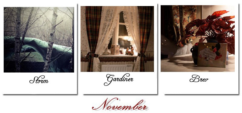 November – Vi är utan telefon och internet i ett par dagar, inte roligt 🙁 Stormen som drar förbi knäcker ett antal träd, visserligen mycket ved men ändå. Gubben snabbar sig att bygga regnskydd så att det kommer förbi dräneringen. Den här årstiden tar nästan knäcken på mig. Vi fick upp gardiner i Micaels kök och han bara älskar sitt kök 🙂 Aldina hjälper mig med brev till min tyska mamma. Hmm är sjukskriven och passar på att ta ner artiklar från MN.