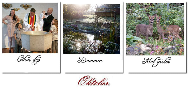 Oktober – Det börjar bli riktigt kallt ute och jag tar upp de sista jordärtskockorna. Lilla Leiha döps och min kamera får sig ett frispel. Vi tar nytt lån för att kunna fortsätta med renoveringen och det är väl något jag inte direkt gillar. Har börjat dela upp maten lite mera till hästarna och det har gett dem betydligt mera energi. Rådjuren som varit borta hela sommaren har börjat dyka upp för att länsa det sista i min trädgård.