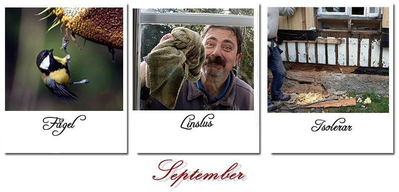 September – Fåglarna är som tokiga i våra solrosor och även trollsländorna verkar ha fått fnatt. Det regnar nästan varje dag 🙁 Gubben byter ut fönstret i hobby rummet och vi börjar ta tag och isolerar så mycket vi kan. Träningen med hästarna går framåt med stormsteg och vi är ute så mycket vi bara kan. Börjar att rikta in hästarnas hovar.
