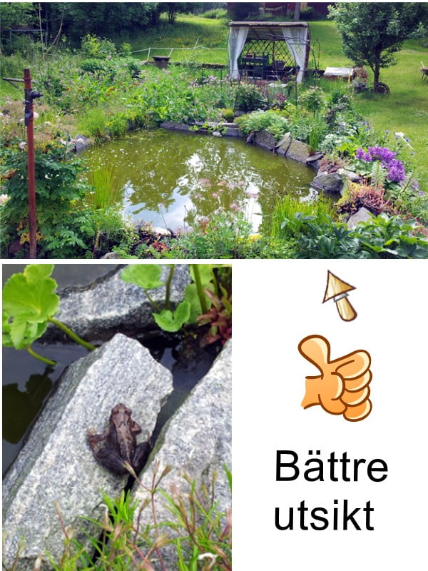 Jag vill sätta platon matta på väggen och bygga något med växter och stenar så vi får ett djurliv även i övre dammen. det är något som fattas men vi vet inte riktigt vad. Just nu är det bara en groda och ett ex antal vattenloppor som bor där.