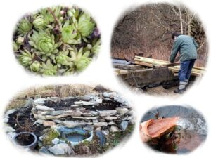 Sedan hjälpte han oss med att flytta ett jättestort stenblock och lägga det framför planterings skyddet. Marken är alltid fuktig där men det har nog berott på att när brunnen varit fyld så läckte väl vattnet ut åt det hållet. Nu kommer vi installera en handmatad gårdspump så vi kan andvända vattnet att vattna blommorna med och fylla på dammen.