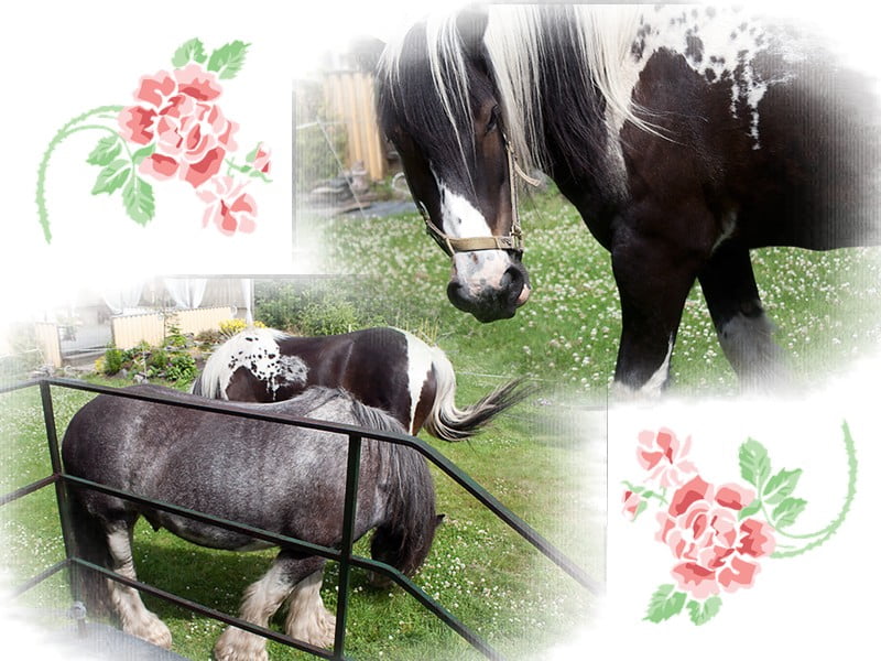 Vi tog och sköljde av dem ordentligt med vattenslangen och de står just nu i svala stallet med lite hö. Tänkte jag skulle få vackra kort med två rena hästar men Beethoven kände att jag hade en banan med sig och då gäller det ju att hålla truten framme så att det bara är till att håva in.