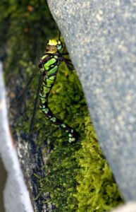 Precis när jag skulle gå ut med Shakira, dök trollsländan upp! Han höll på och att flyga på mig ett par gånger och verkade inte bli speciellt störd på att jag var så nära. Såg att han bökade med svansen och tänkte väl inte så mycket mer på det, jag skulle ju på promenad och Shakira studsade glatt runt mig. Hade tänkt kolla om det fanns lite svamp jag kunde fotografera.