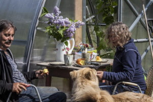 Just nu är vi hundvakt åt Maja och Pärla igen, och de fyller tomten med sådan livsglädje. Tillsammans med Jippy och Jackpot blir de som ett eget litet fyrbent gäng – de rusar genom gräset, nosar nyfiket bland odlingstunnlarna, utforskar skogsdelen och avslutar med lyckliga språng i den lilla hagen.
