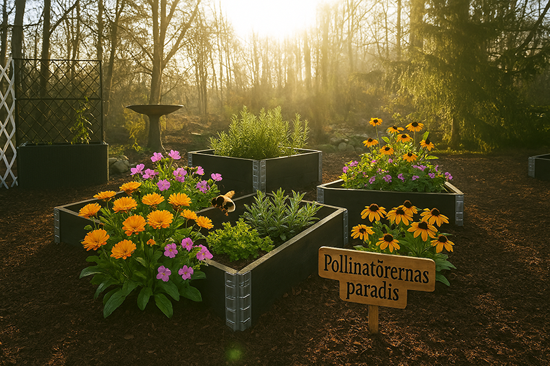 Nu är Pollinatörernas paradis färdig! Den visar en solig pallkrage fylld med nektarrika blommor som ringblommor, pelargoner och rudbeckia — med en surrande humla i fokus och en liten skylt som bär namnet. Solen silas genom träden och skapar en varm, glittrande stämning.