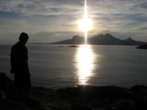 På fredagen blev det sedan fotbollsmatch mellan brudens och brudgummens lag och grillning i Ausvika. Även där vidunderliga vyer och jag hade lite svårt att koncentrera mig på grillningen när det var så mycket att se på. Solen lyste så starkt att jag fick fotografera på måfå och hoppas att skärpan han ställa in sig innan jag tryckte av. De korten jag tog emot solen blev riktigt fina, det ser ut som om det är mörkt ute. Jag kan förstå att syrran hade svårt att få in barnen när de var små.