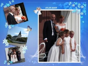 Så kom då den stora dagen och vi hann med dekorationen med ruskigt små marginaler, det var till att byta om med ilfart. Claes-Olof och pojkarna hade stryket alla kläder och satt band på en sång som syrran hade skrivit. Det var 70 gäster så de hade fått knyta på bra och såg lite stressade ut när vi kom och skulle byta om. Jag tyckte det var härligt att se dem klara och fina i sina kostymer och vi begav oss med stor spänning och glädje till kyrkan. Det var ett vackert bröllop med ett vackert brudpar och otroligt söta små tänor.