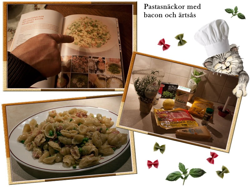 Vi har äntligen köpt kastruller och traktörpanna till Tobias så att han kan börja laga sin egen mat. Han har flera böcker med Jamie Oliver och denna som vi lånade ( Matrevolution ) hade flera lättlagade recept. Vi valde Små pastasnäckor med krämig bacon och ärt sås.