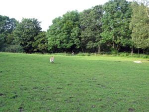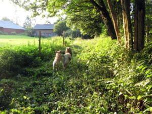 I dag var det Alfhild som fick sig en pärla och blev rädd. Elvy stod och körde trimmern i samma veva så Alfhild vågade sig inte tillbaka förrän vi stängt av den och gått över till att lia i stället. Jag drog om tråden så man kunde promenera på hela slingan igen. Alfhild hade gått med mig runt när jag drog tråden, så hon blev helt överlycklig när hon fick syn på Elvy på andra sidan. Shakira hade hittat något som luktade i hennes nos mumma, men i våra näsor definitivt något annat. Hon rullade sig flera gånger i detta så det blev till att ta en bad paus innan vi fortsatte. Det var härligt att se Shakiras glädje igen, undan för undan när vi busade runt på slingan och hon jagade runt med Alfhild. Det var viktigt att få henne att gå slingan runt utan att gena och försöka springa hem.