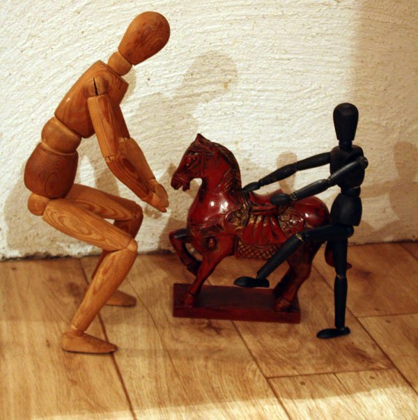 Han slet upp paketet och där var en jättevacker häst. Micael fick tag på ett paket som var till honom och när han följde snöret så satt där ett paket till Nina. Han skrattade gott åt det roliga sättet paketen satt ihop på. Nu sitter jag med en kopp kaffe och kopplar av medans Lill-polarn och Wumba Wu leker med hästen. Lill-polarn ger Wumba Wu en hjälpande hand så han kommer upp på hästen.
