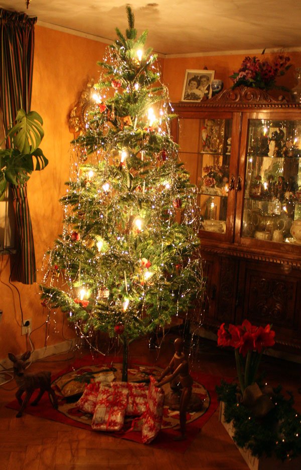 När pojkarna var små, speciellt Micael hade problem med att låta granen och paketen vara i fred, så satte vi upp en tomte i granen som höll vakt. Den traditionen har hängt med i alla år och nu hade gubben satt tomten runt stammen. Lill-polarn har tillbringat hela dagen vid granen och labbat runt på allt.