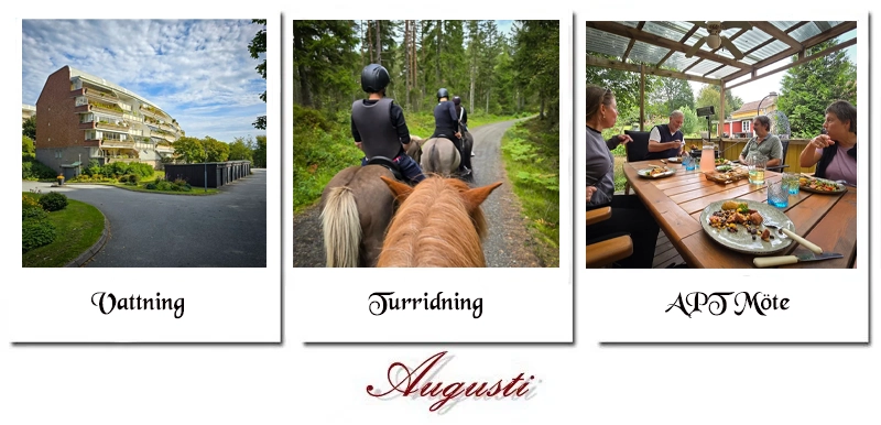 Augusti – Det börjar redan bli kallt på morgonen. Jag får börja använda glasögon och Shakira testar om de är något att ha 🙂 Fönsterna är utbytta hos Micael och övervåningens 2 rum tapetserade. Monica börjar få kanon kläm på Bellman och vi byter ut hästarnas mat. Får en god skörd på örterna och vill öka ut till nästa år.