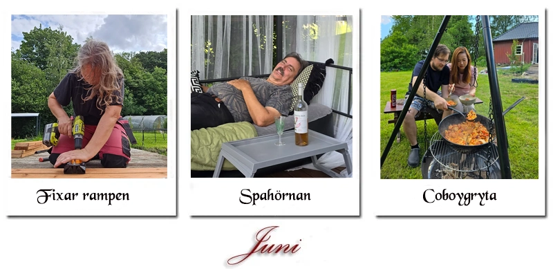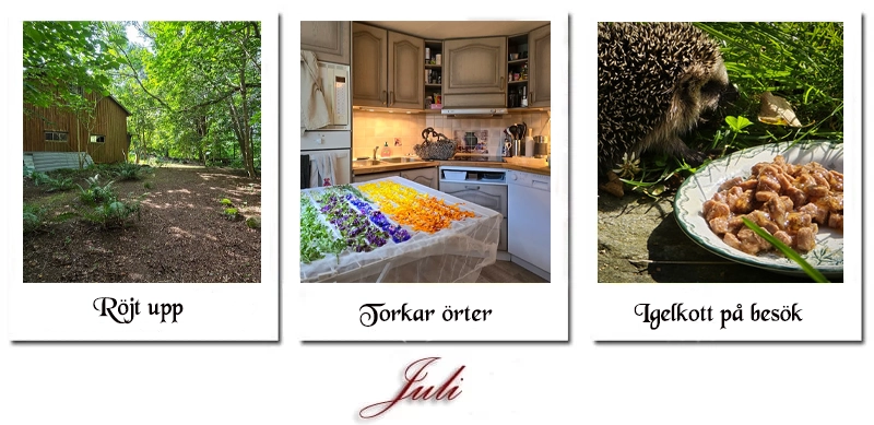 Juni – Nu har vi börjat renovera rejält i Micaels kokhus, river innertak och väggar. Gamla tidningar, flaska och portmonnä som knappt håller ihop är kokhuset dolda skatt, ja en ettöring hittade vi också. Sen bland det bästa som hänt i år är att lille Pepper kom. Jösses! Vilket yrväder. Nedre dammen börjar bli riktigt fin och jag älskar att dofta på mina kryddor.
