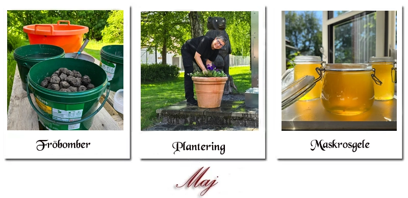 Maj – Det börjar blomma överallt och jag ligger på Tobias gräsmatta och bara luktar in blommornas alla dofter. Älskar den här månaden. Tar kontakt med Frälsningsarmén och får reda på att min biologiska pappa är död. Blev lite av en chock och en rejäl puff på att söka efter min bror och mamma. Vår damm börjar så sakteliga ta form.