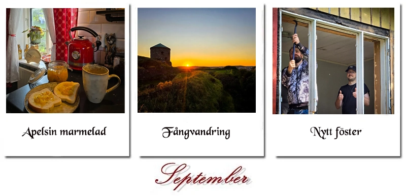 September – Snickaren börjar att rätta till gaveln på kokhuset, gubben har fixat nya dörrar och Micael och jag tömmer garaget på allt skräp. Edgar tar vara på de sista varma dagarna, det har börjat bli kallt på morgonen. Fick brev igen från Frälsningsarmén, de hade hittat min biologiska mamma och jag fick bekräftat att jag har en storebror till. Härligt.