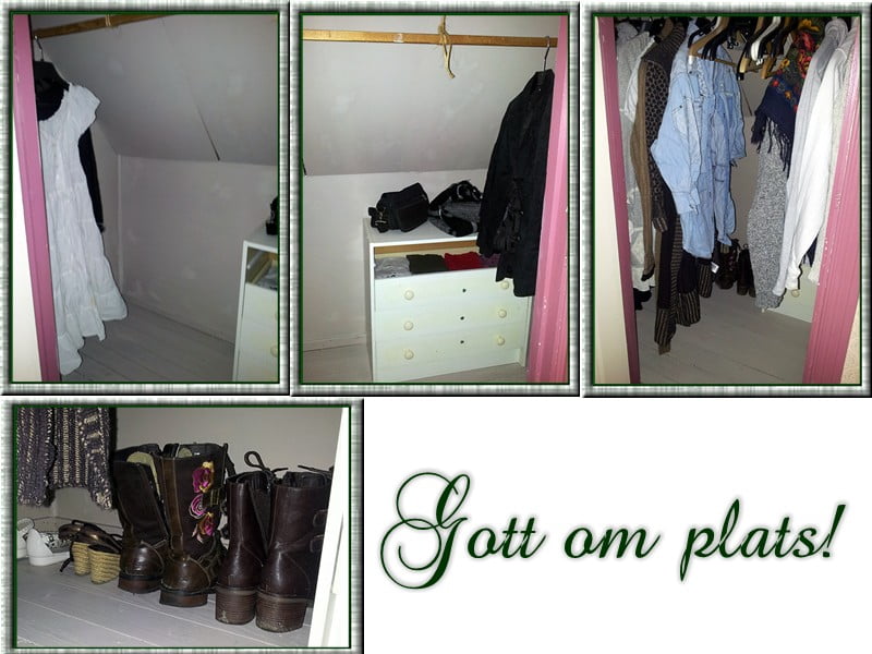 Nu fick jag ihop 3 bärkassar kläder som var för små och flyttat in en byrå med sommar kläder. Nu är där luftigt och fullt med kläder så inte behöver jag köpa något nytt. Det kändes ju riktigt skämmigt att se hur mycket jag egentligen hade, jag som absolut inget hade?! Gott att få överblick och kommer att pressa på gubben tills han även tömmer sina kläder.