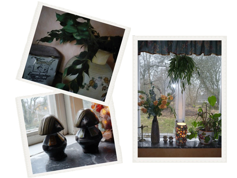 Den stora Kanolds burken och den gamla krukan har jag fått av Rosa när hon flyttade in i sitt hus och behövde bli av med lite jox. Jag samlar och älskar gamla burkar och gamla ting så jag blev överlycklig. Tills jag hittat en bättre plats så får porslinsblomman vara i krukan, men den lär nog behövas flytta snart och jag har en stor kruka med garderobsblomma som klarar av att stå så mörk som jag funderar att ha där istället.