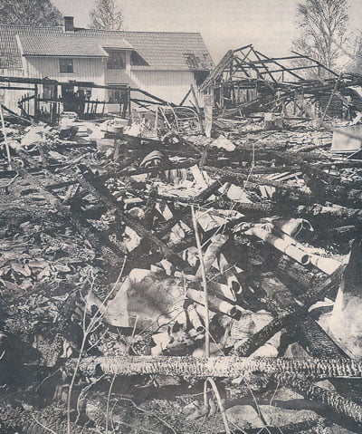 Gubben for runt som en skottspole och jag hade fullt sjå med att hålla honom lugn. Själv kände jag mig som en zombie. Plötsligt började nock pannorna flyga upp i luften en efter en mot boningshuset och så blev det knäpptyst och man funderade på vad syret i luften tog vägen. Det hördes ett enormt sus och det blev ett eldhav utan dess like. Brandmännen siktade då alla slangar mot boningshuset men hettan gjorde att det började brinna även där. Denna natt förlorade vi bara en lada. Det finns folk som har förlorat sina hem och ännu värre sina nära och kära. Jag kan fortfarande tänka på dessa lugna stabila brandmän som kämpade med att inte vårt boningshus skulle brinna ner. Jag höll mig lugn hela tiden men ett par veckor efter så kom ångesten krypande och jag tyckte det luktade rök överallt. Taken ryker, asfalten ryker och även gräset ryker om det är kallt i luften. Jag tyckte bokstavligen att hela världen ryker om man tittar noga. Så hade jag tagit kortet strax efter branden så hade jag slängt det och tyckt att det var en gräslig bild.