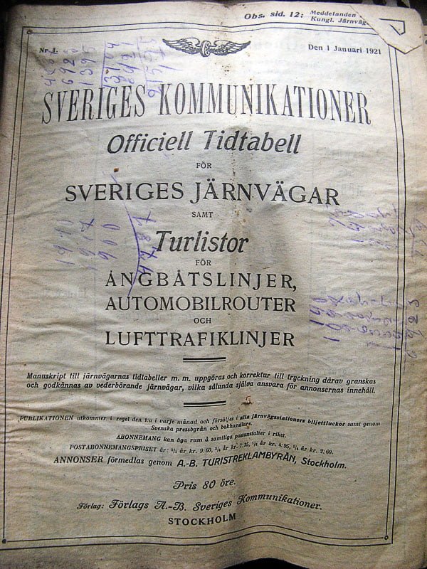 Dagens bild är på en tågtidstabell från 1921. Gubben hittade den när han höll på med att ta ner innertaket i kokhuset. Det blir Micael förmodligen som skall flytta in där och när han kommer hem från Stockholm får han börja hjälpa till med renoveringen. Det är ett sött hus på ca 90 kvadratmeter. Bitvis i dåligt skick men det kan bli otroligt fint när vi är klara. Får se om vi hittar mer skojiga saker som isolering allt eftersom vi jobbar oss runt i huset.