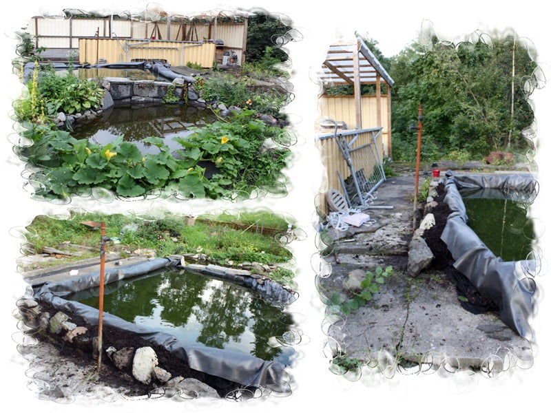 Det verkar bli riktigt fint väder idag, så jag tänkte passa på att göra färdigt vid dammen. Lill-polarn följde ivrigt med för att hjälpa till – han skulle vika dammduken så att den inte syntes och kolla att allt såg bra ut.
