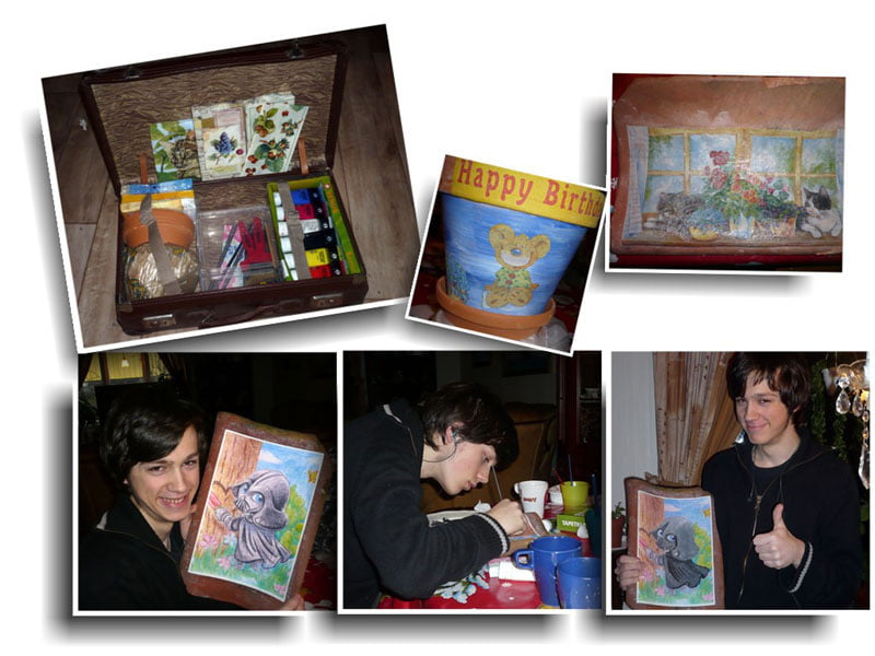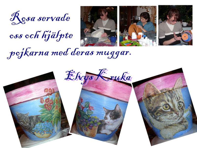 Rosas pojkar målade muggar med porslinsfärg och Monica putsade upp mina träns. Elvy målade och körde decopage på olika burkar. Jag verkligen älskar de här pysselstunderna då man kan testa sånt som man varit lite sugen på att göra och det är så mycket roligare om man är flera stycken. Rosa sprang runt och hjälpte oss alla till rätta så hon han inte riktigt att pyssla själv idag och jag var så uppe i varv att det var nära de fick ett krackelerat vardagsrumsgolv. Fast det kanske hade varit ett lyft? vem vet.