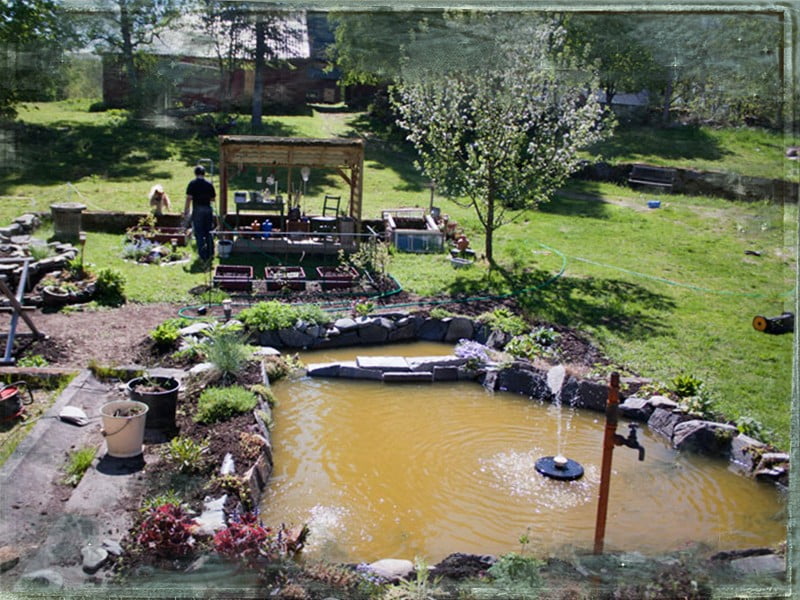 Vi funderar att sätta filter på pumpen så vattnet blir lite renare. Nu har vi grejat klart kanterna så det kommer väl inte att ramla ner så mycket mera jord. Vi skall snart åka ner till Åkraberg och höra efter om de har något smidigt sätt. Djuren dricker ur dammen varje dag så det får inte vara något kemikaliskt, har hört att vissa blommor och växter kan rensa en hel del. Som det är nu har vi bara en vattenväxt i och det hade varit roligt med lite flera sorter.