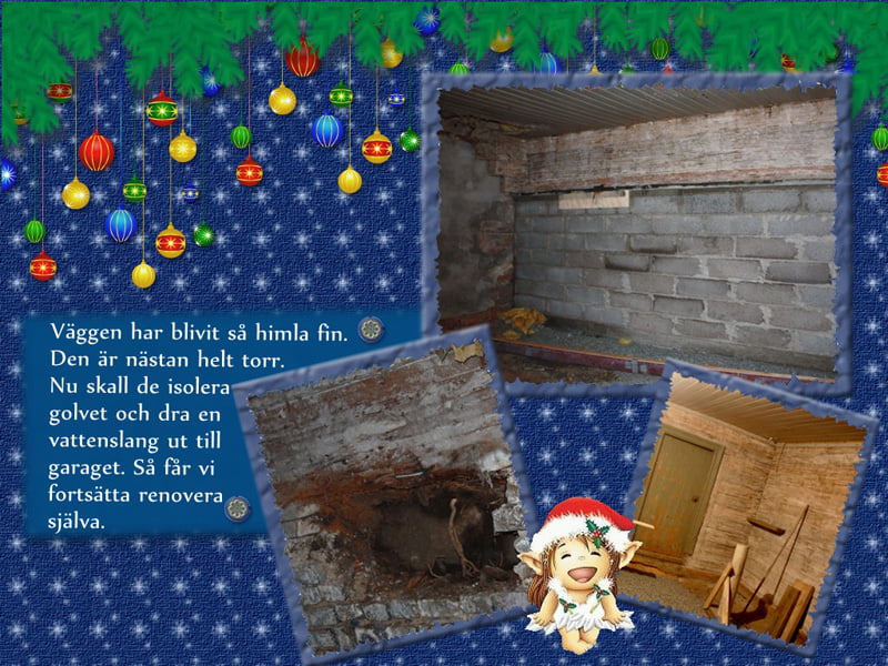När vi äntligen kom hem ville Lill-porlan så gärna gå ut och hjälpa gubben att isolera färdigt i kokhuset. Han har märk hur glad Micael blir varje gång man är därute och jobbar och menade på att om han fick hjälpa till så skulle det minsann bli färdigt på direkten och inte ta så lång tid som till sommaren. Men han hann inte mer än innanför dörren, förrän han gjorde världens rova. Ojoj! vad ledsen Lill-porlan blev, han som så gärna ville hjälpa till.