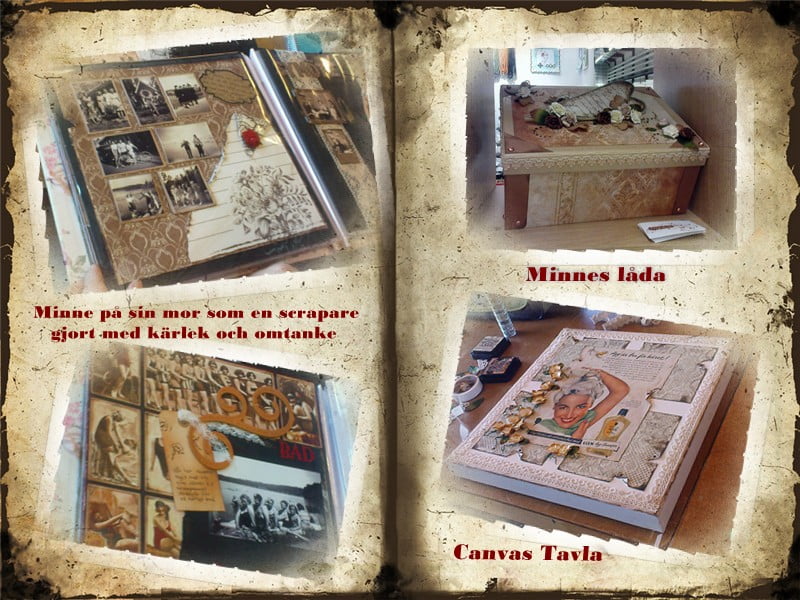 Det var en dam som hade sitt album med på bilder på sin mamma och olika minnessaker som inbjudningskort o.s.v. Det var gjort med så stor omtanke och kärlek, jag blev så imponerad hur vackert hon hade klistrat in mynt och saker som verkligen betydde något för personerna i albumet. Det var en inspirations källa utan dess like. Rosa var gullig att fota tavlor och askar som jag tyckte var kanon vackra.