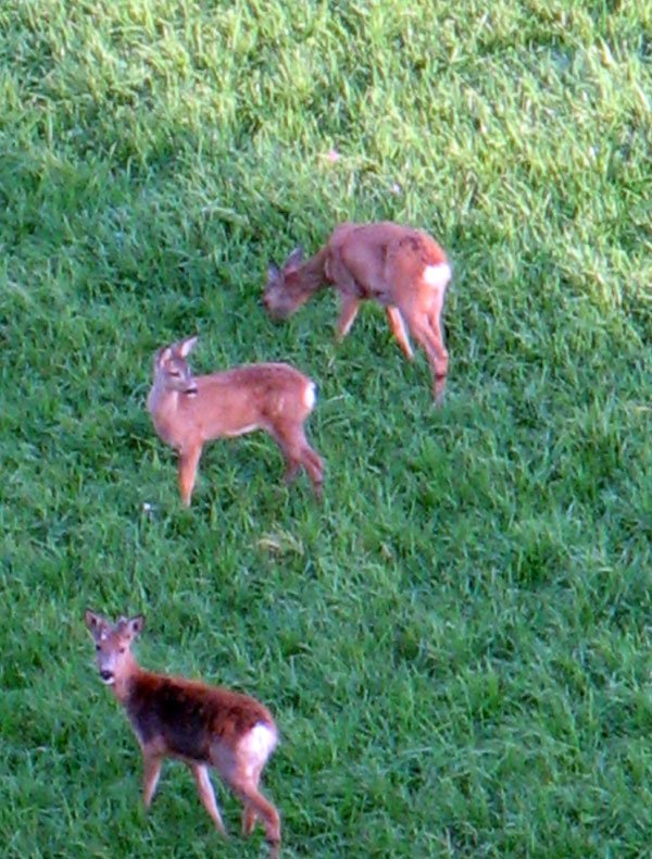 När vi stod uppe på berget kunde vi se ned i farbrorns trädgård och vi vinkade till honom, han i sin tur pekade mot ängarna där 3 rådjur gick och betade. Vi såg att farbrorn hela tiden höll ett öga på oss så vi tänkte att det är bäst att vi går förbi huset på väg hem igen så han inte tror vi är kvar på toppen.