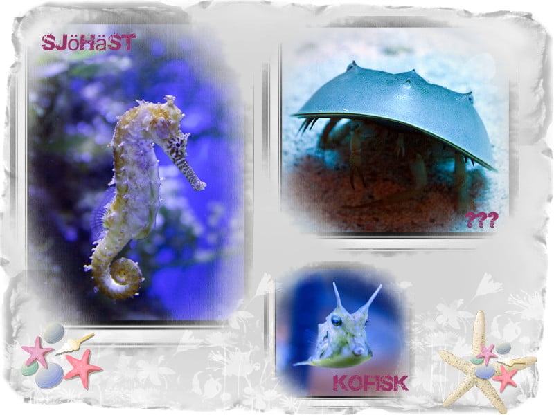 När vi hade saltvattens akvarium så hade vi sjöhästar, de är så himla fina att se på där de glider fram. Det som ser ut som ett ufo är en krabba av något slag. Den gula ko fisken blev Elvy hel såld på, den vände riktning så fort hon petade på rutan. Egentligen var det tur att de var lite trångt på museet, det blev att vi gick ut och promenerade vid Gathenhielmska kulturreservatet (Riktigt gamla byggnader) Mer kommer i morgon.