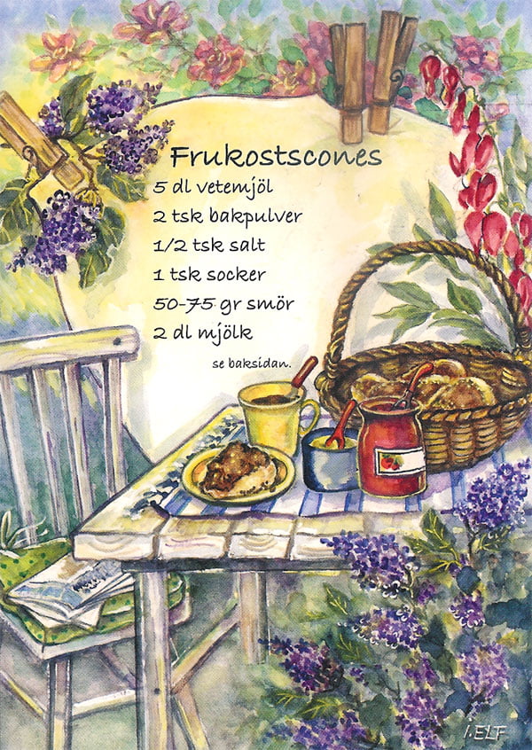 Blanda samman mjöl, bakpulver, salt och socker. Finfördela smöret i de torra ingredienserna, blanda ner mjölken och arbeta samman degen. Dela den i 2 delar och klappa ut varje del till en rund platta på bakplåtspapper som lägges på en plåt. Skär varje rundel i 4 delar och nagga med gaffel ovanpå. Grädda i 225-250 omkr. 10 min. Strax innan bröden är färdiga säras kakorna åt på plåten för att de skall bli gräddade även på sidorna. Serveras ljumma, delade mitt itu med smör och en god marmelad.