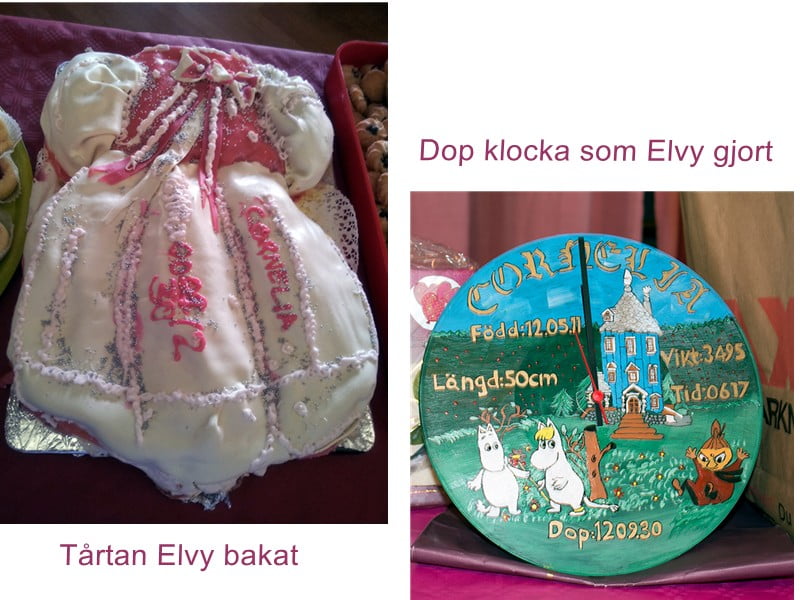 Elvy hade gjort en kanon fin klocka av en lp skiva och bakat världens sötaste tårta. Wow! Vilket jobb hon hade lagt ner. Ups! Måste upp och fodra, hinner jag lägger jag in lite bilder från dopet. Tur Rosa lånade min mobil för mina kort blev bara totalt skit. Fick ett par fina kort på Jimmy och Cornelia resten är under all kritik.