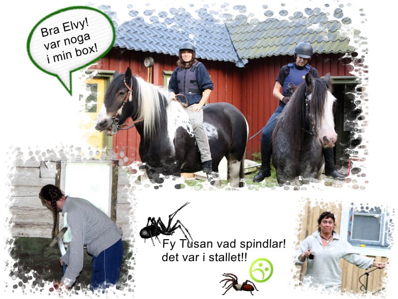I dag var det en perfekt kärring onsdag. Jag och Monica skulle rida i området och träna hästarna i den branta backen, medan Rosa och Elvy sopade stallväggar rent från damm och spindlar. Beethoven som haft lite problem i backarna har fattat att han måste ha upp huvudet mera och inte korsa benen som han gärna har gjort förut. Bellman har börjat att trycka på bra bak men jobbade nästan inget fram idag. Skall ta och tumköra honom mera så jag ser lite bättre hur han rör sig.