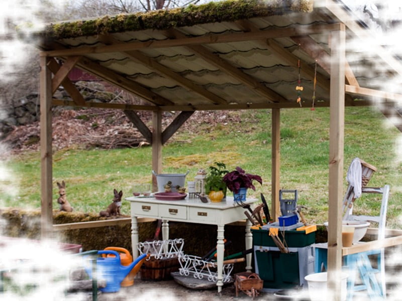 La först mossa och fyllde på med jord i röret på planteringsskyddet. Det får plats mer än man tror där under. När spaljén kommer upp och klängväxter runt så kommer det inte att skvätta in så mycket vatten när det regnar. Behöver fixa till bordet och lägga på kakel, som det är nu är det lite vingligt. Det stod kvar i huset när vi flyttade in och det är flitigt använt av både mig och sönerna när vi har pysslat.
